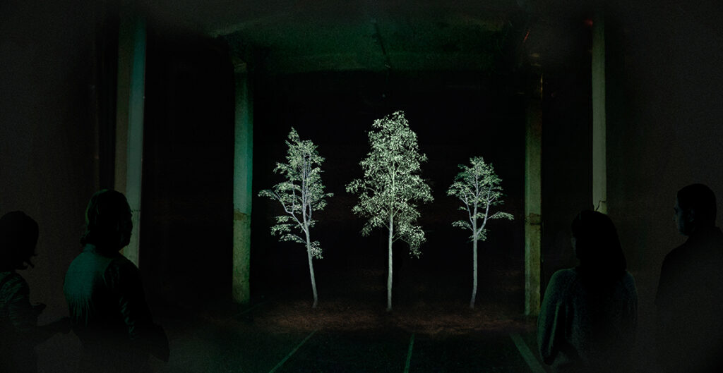 Paula Cremades’ work should be understood in the context of the climate crisis we are currently experiencing, which highlights the need to care for nature and the exponential expansion of the virtual world, which is imitating reality with increasing accuracy. In this context, the artist Paula Cremades decided to plant three virtual trees on the room’s barren floor. In her work, light corresponds to the sap of these trees and plays a fundamental role in their existence.