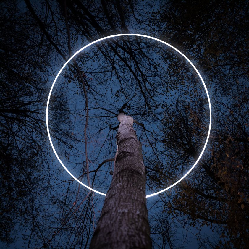 AURA, by Xevi Bayona and Alex Posada, is an immersive experience consisting of 16 rings of light installed in trees that illuminate the surrounding area and cast shadows that evolve slowly over time. Aura means the light or immaterial luminous radiance that envelops certain objects. In the installation, designed for the Los Planteles Garden in El Retiro Park, the light vibrates and moves to the beat of the sound, creating dreamlike atmospheres that contrast with the natural landscape of the forest.