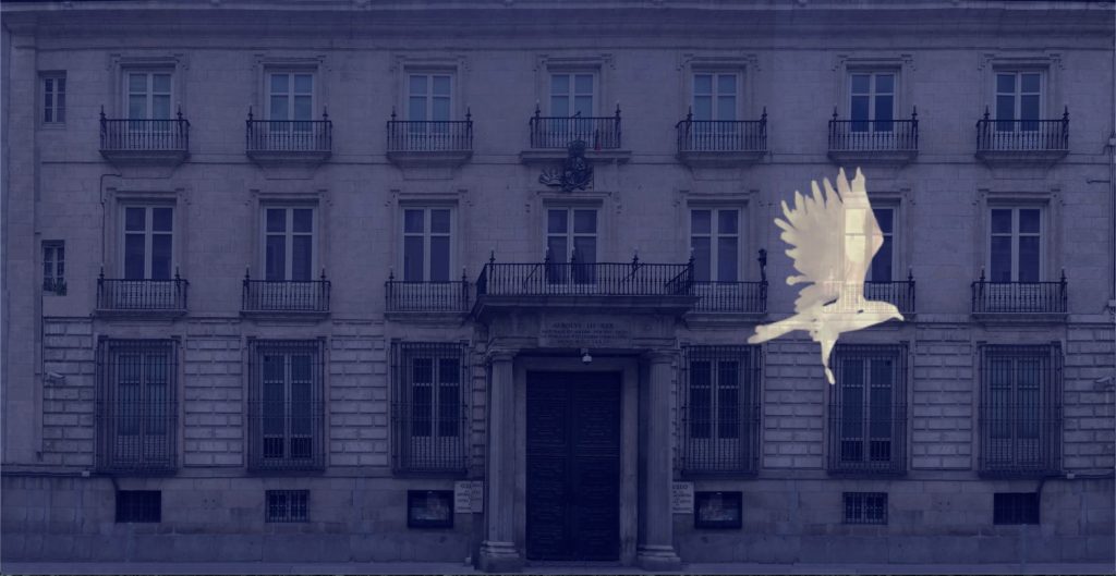 Pieza integrante de Invasores Contemporáneos, proyecto comisariado por Julieta de Haro que pone en valor la capacidad de transformación, experimentación y conquista de nuevos escenarios del artista. Los creadores se convierten en invasores de las fachadas de emblemáticos edificios de Madrid: su acervo cultural o la vida de su interior se expanden simbólicamente hacia fuera desde una perspectiva contemporánea, como alegoría del tiempo pasado y presente.