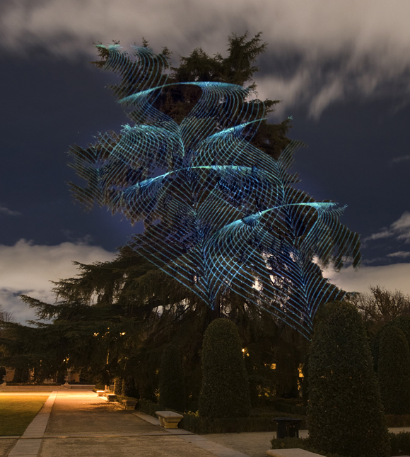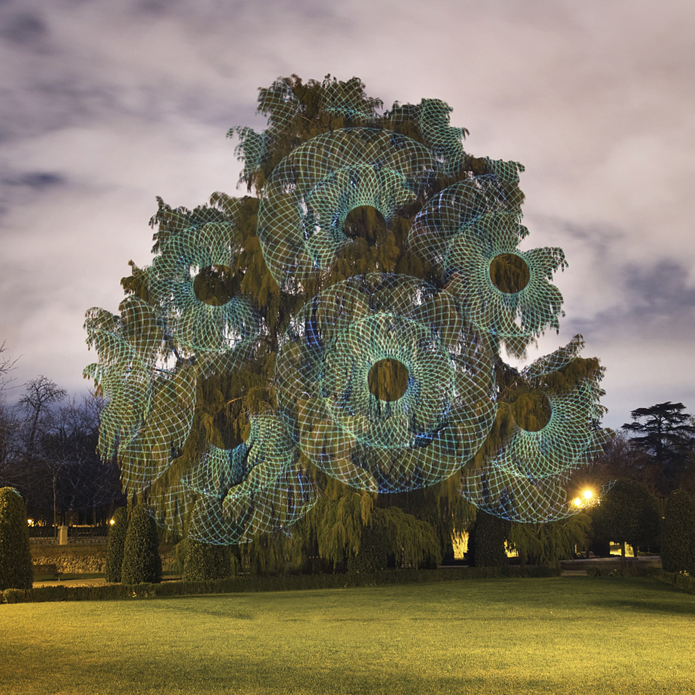 El trabajo de Javier Riera se basa en proyecciones de luz de formas geométricas realizadas directamente sobre la vegetación. La iluminación se posará en esta ocasión sobre los árboles de El Retiro, apelando al sugerente poder que encontrarán los asistentes a la acción en la modificación del paisaje, con objeto de ampliar su percepción.