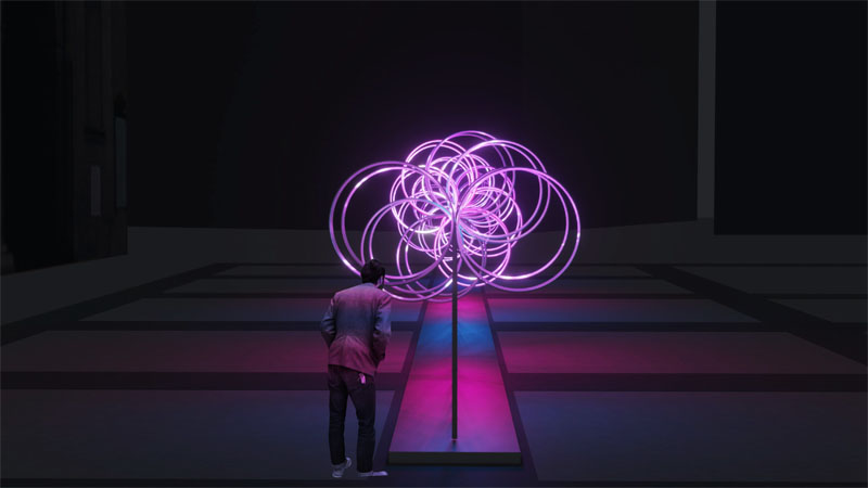 Inspirada en las figuras de Optical Art de los años 60, Kinetic Perspective parte de una figura simple: un círculo que se duplica y rota repetidamente para crear efectos gracias a la perspectiva. De este modo se va generando una pieza geométrica abstracta, inmersiva, que juega con la percepción del espectador evocando la impresión de movimiento.