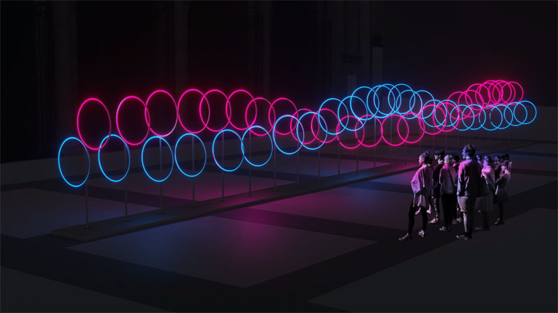 Dieciocho piezas en línea, cada una compuesta por dos aros que giran coordinadamente, forman una perspectiva en fuga colocada a la altura de los ojos del visitante y le invitan a observar y participar activamente: debe moverse para así descubrir los patrones, destellos y deformaciones que le desvelarán una nueva geometría oculta.
