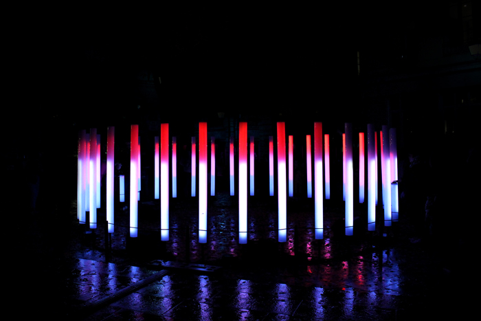 En Rythmus, la mano y, por extensión, el cuerpo, son el medio para conectarnos con nuestro ritmo biológico y con la escultura orbicular que constituye la pieza: una instalación que materializa en imágenes el latido del corazón de dos personas conectadas, cara a cara, a una red circular de tótems de luz interactivos. Estos toman vida, se desarrollan y evolucionan en conexión con las concordancias y diferencias de un fenómeno tan vital e íntimo como es el ritmo cardíaco de los usuarios.