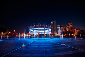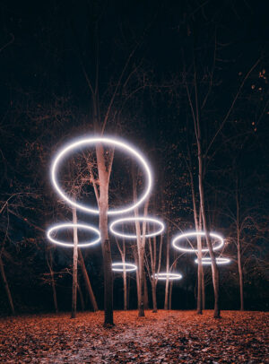 AURA, de Xevi Bayona y Álex Posada, es una experiencia inmersiva para el Jardín de Los Planteles de El Retiro que consta de 16 anillos de luz instalados en árboles que iluminan de manera elegante el entorno y generan sombras que evolucionan lentamente con el paso del tiempo. En la instalación la luz vibra y se mueve al ritmo del sonido, creando atmósferas oníricas que contrastan con el paisaje natural del bosque.