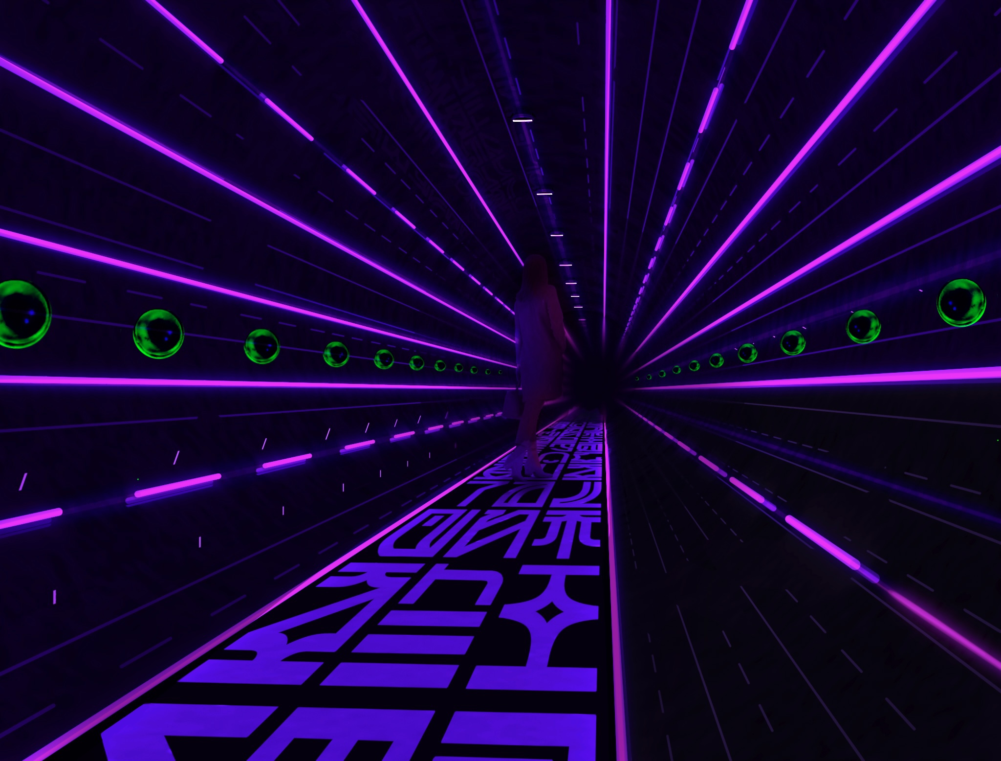 NOSTALGIA DEL DESPLAZAMIENTO es una instalación a modo de túnel de luces infinitas de los artistas Galoguin y Atalanta . Gracias a la luz y sus destellos, se estimula la visión del espectador sumergiéndonos en un trance que nos despierta recuerdos y emociones relacionadas con largos viajes por carretera, los sueños y la fugacidad de la vida. En el interior, unos signos ilegibles nos transportan hacia lo desconocido, otro lugar o incluso otra época. Una invitación hacia lo desconocido.