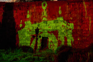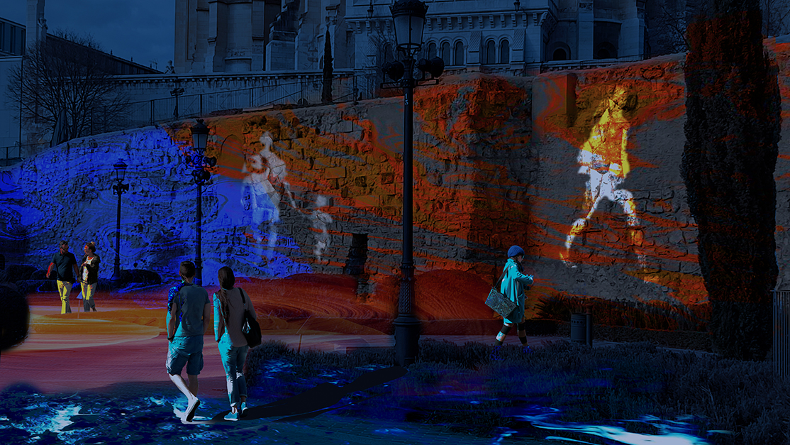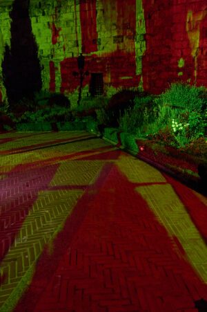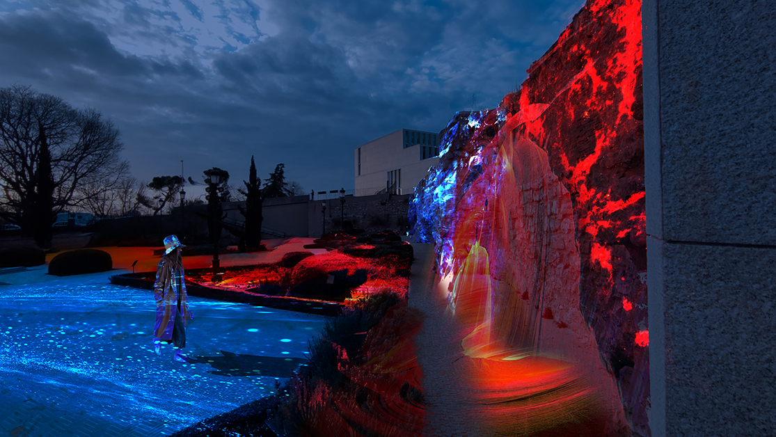 MAYRIT. AGUA, PIEDRA, FUEGO Y CARNE es una obra site-specific diseñada por Ezequiel Nobili para la Muralla Árabe y tiene como objetivo revalorizar y transmitir el significado de los restos arqueológicos que conservamos de la primera muralla de Madrid. A través de un sistema de micrófonos y cámaras de circuito cerrado, se proyectará la imagen de los visitantes sobre la muralla y la piedra sobre ellos, creando una luz que se retroalimenta plástica y recíprocamente.