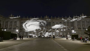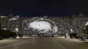 HURACÁN (UN SISTEMA METEOROLÓGICO) es la pieza que Eugenio Ampudia, uno de los más importantes artistas españoles, ha creado para la Fachada del Palacio Real. Una proyección que reflexiona acerca de la fuerza abrumadora del aire.