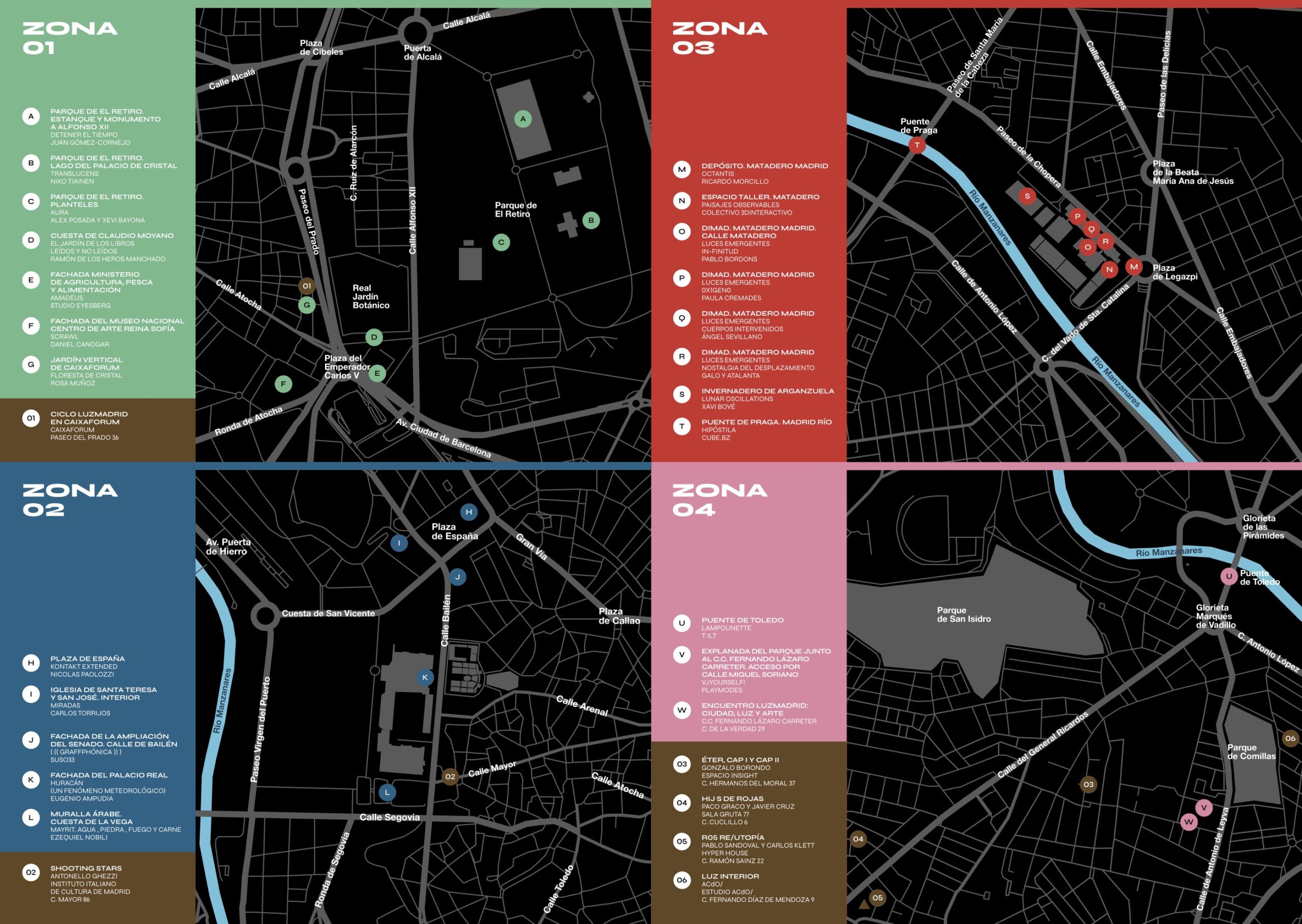 Cuatro grandes zonas de Madrid configuran el mapa de luz del festival internacional, que cuenta con más de una veintena de obras artísticas de creadores nacionales e internacionales, algunas de ellas producidas de manera exclusiva para LuzMadrid.