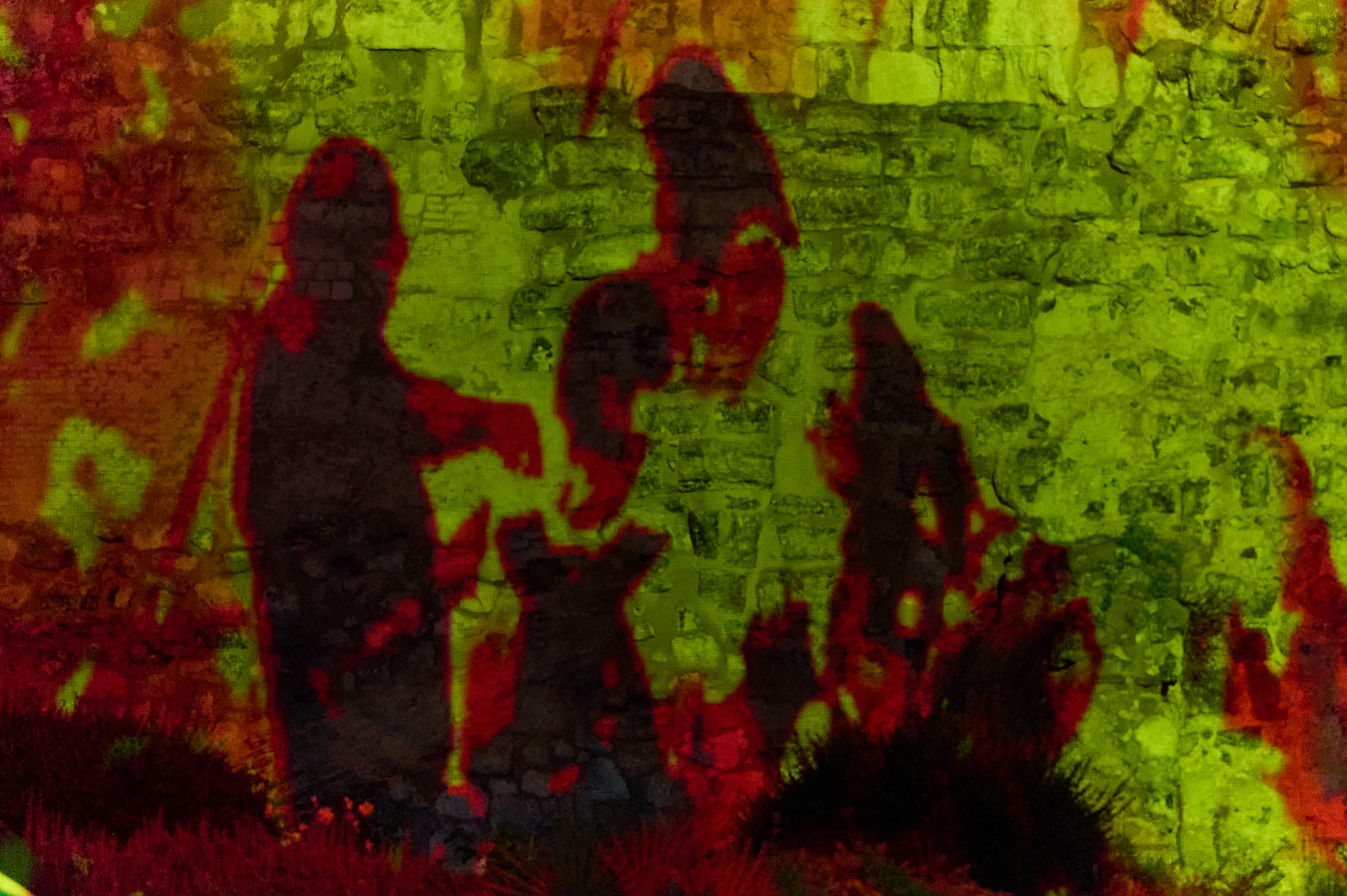 LuzMadrid, el Festival Internacional de la Luz, que se celebrará del viernes 27 de octubre al domingo 29, ultima los preparativos del montaje de una de sus piezas. Mayrit. Agua, piedra, fuego y carne, en la muralla árabe, en la víspera del arranque del festival.